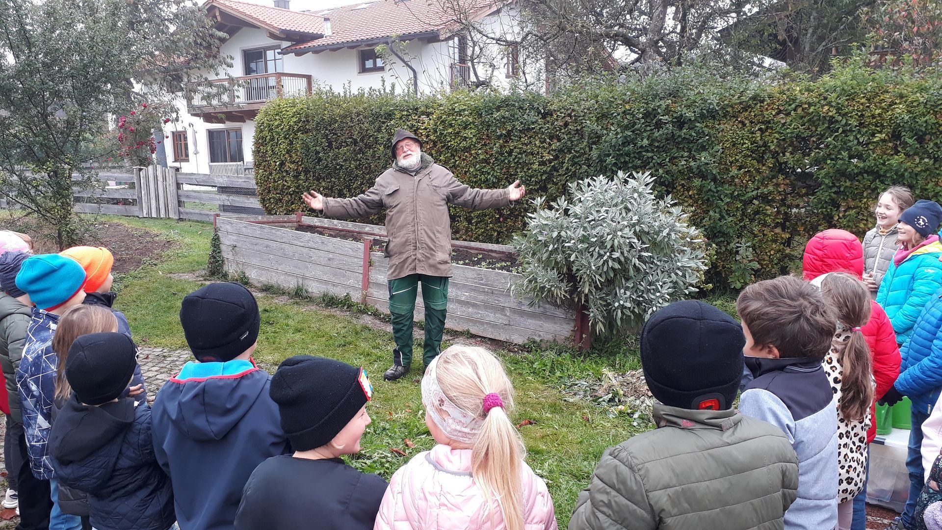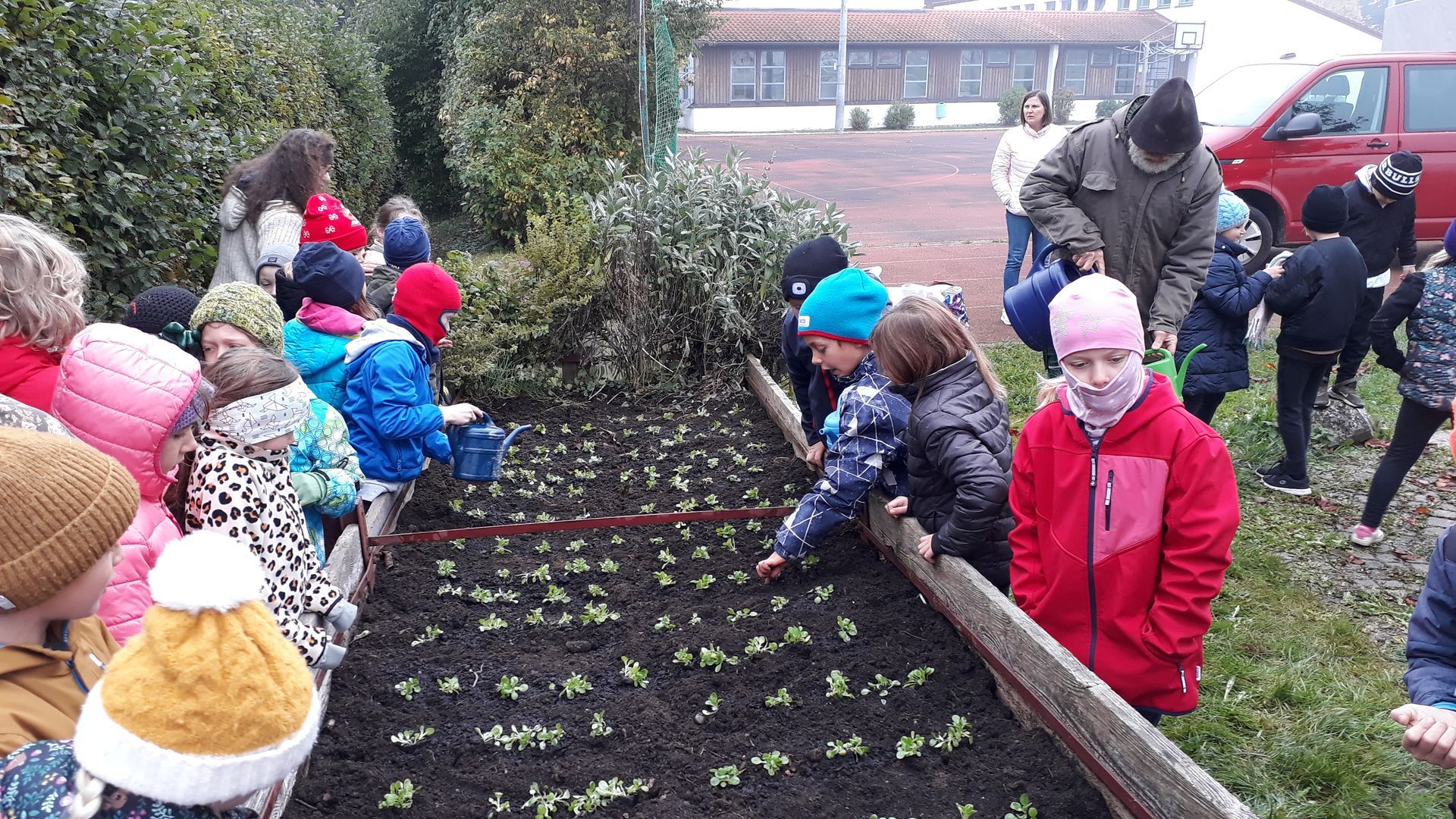 Im Oktober kochten die zweiten Klassen nicht nur Gemüsesuppe. Herr Pummerer besuchte uns in der Schule und pflanzte mit uns am Hochbeet Feldsalat. Zuvor hatten die fleißigen Hände der Klasse 2b das Beet gemeinsam mit Frau Niederberger vorbereitet, Unkraut ausgezupft und die Erde gelockert. So konnten nun alle Kinder behutsam und vorsichtig die jungen Salatpflanzen einsetzen. Ein großes Dankeschön geht an Herrn Pummerer, der uns auch dieses Jahr wieder bei der Bepflanzung und Versorgung des Hochbeetes tatkräftig unterstützt. Die Kinder bedankten sich bei ihm mit dem gemeinsamen Vortrag des Gedichtes „Gemüseball“. Wir freuen uns schon auf die erste Ernte!